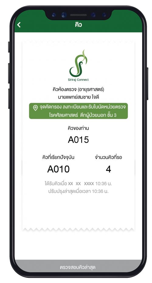 - การเช็คอินลงทะเบียนตรวจเพื่อยืนยันเวลานัดก่อนเข้าพบแพทย์ (Check-in and Queue Notification) ผู้ใช้บริการสามารถเช็คอินหรือลงทะเบียนตรวจล่วงหน้าผ่านแอปฯ ในวันตรวจตั้งแต่เวลา 06.00 น. จนถึงก่อนเวลานัด 30 นาที สามารถใช้เวลาระหว่างรอคิวทำธุระต่างๆ ได้อย่างสบายใจ เพราะเมื่อใกล้ถึงคิว ระบบจะแจ้งเตือนคิวตรวจ (Queue Notification) และสามารถเช็คคิวผ่านแอปฯ ได้แบบเรียลไทม์ ช่วยลดความแออัดหน้าห้องตรวจ และคลายความกังวลเรื่องคิวให้กับผู้ใช้บริการ (ระบบเช็คอินลงทะเบียนตรวจล่วงหน้าเริ่มใช้งานแล้วในคลีนิคอายุรศาสตร์ และอยู่ระหว่างการขยายงานให้ครบทุกคลีนิคในปีนี้)