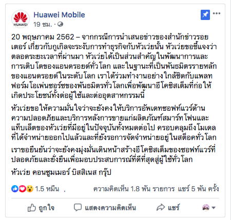 เย็นเมื่อวานหัวเหว่ยโพสในเพจทางการตัวเอง สรุปใจความคือ ที่เกิดขึ้นมันคือเรื่องจริงแหละค่ะ แต่ทางหัวเหว่ยพยายามให้ความมั่นใจจะอัพเดทซอฟท์แวร์ด้านความปลอดภัย และดูแลทุกคนที่ใช้หัวเหว่ย และ ออนเนอร์ รวมทั้งสินค้าแท็บเล็ตหัวเหว่ยและที่ยังมีสต็อคทั่วโลกทิ้งท้ายว่า อันนี้โควตมาค่ะ