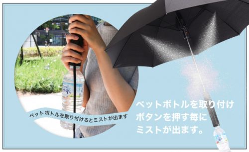 ภายนอกจะเหมือนร่มทั่วไปแต่ด้านในจะติดตั้งพัดลมเพิ่มความเย็นตามปกติ ถ้าเราอยากได้ความชุ่มชื้นให้มากขึ้นก็แค่ใส่น้ำเข้าไปก็จะกลายเป็นพัดลมพ่นละอองน้ำออกมา การใส่น้ำเข้าไปก็ง่ายมากเลยค่ะ ตรงก้านจับจะมีกลไกสำหรับเสียบขวดน้ำดื่มเข้าไป เสียบได้ทั้งขวดเล็กหรือขวดลิตรที่มีขนาดเส้นผ่าศูนย์กลางของปากขวด 28 มิลลิเมตร จากนั้นก็กดปุ่มที่ด้ามจับเวลาที่อยากได้ละอองน้ำเพิ่มความเย็น