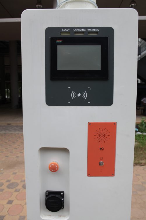 ด้านล่างของเสาไฟจะเป็นแท่นชาร์จรถยนต์ไฟฟ้า เพื่ออำนวยความสะดวกให้กับคนที่เข้ามาใช้บริการในมหาวิทยาลัย เมื่อมีการเก็บค่าบริการเราจะต้องใช้บัตรแตพที่เครื่องเพื่อทำการจ่ายเงิน ที่พื้นยังมีการติดตั้งเซ็นเซอร์ตรวจจับว่าที่จอดรถว่างอยู่หรือเปล่า ช่วยให้หาที่จอดรถได้เร็วขึ้น ไม่ต้องวนหาให้เสียเวลา ซึ่งต่อไปจะใช้งานได้ผ่านแอปของทางมหาวิทยาลัยเอง