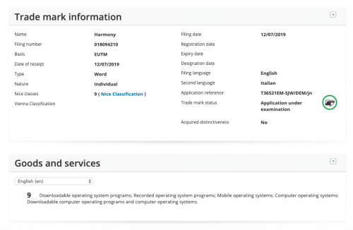 ตอนนี้บริษัทผู้ผลิตสมาร์ทโฟนรายใหญ่อันดับที่สองของโลกได้ทำการจดเครื่องหมายการค้ากับ European Union Intellectual Property Office ในชื่อ “Harmony” เพื่อใช้เป็นระบบปฏิบัติการสำหรับสมาร์ทโฟนแและคอมพิวเตอร์ ซึ่งยื่นเรื่องไปตั้ง 12 กรกฎาคม 2019 นี่เอง ซึ่งตอนนี้อยู่ในขั้นตอนของการพิจารณาอนุมัติ
