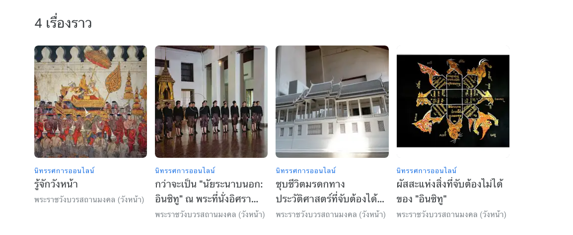 Google Arts & Culture ร่วมมือกับกรมศิลปากร กระทรวงวัฒนธรรม ภายใต้การสนับสนุนจากท่านผู้หญิงสิริกิติยา เจนเซน เปิดตัวนิทรรศการ “วังหน้านฤมิต ในมิติแห่งกาลเวลา” ในรูปแบบดิจิทัล นิทรรศการดังกล่าวจัดทำขึ้นโดยมีวัตถุประสงค์เพื่อถ่ายทอดเรื่องราวของ พระราชวังบวรสถานมงคล หรือ “วังหน้า” ในขณะเดียวกันก็เป็นการเปิดชั้นข้อมูลต่างๆ ของประวัติศาสตร์ที่เคยค้นพบมาก่อน โดยได้รวบรวมคอลเล็กชันพิเศษต่างๆ เพื่อเปิดโอกาสให้คนทั่วโลกได้เรียนรู้ประวัติศาสตร์และวัฒนธรรมของไทยที่อยู่เบื้องหลังอนุสรณ์สถานอันเป็นสมบัติล้ำค่าของชาติ