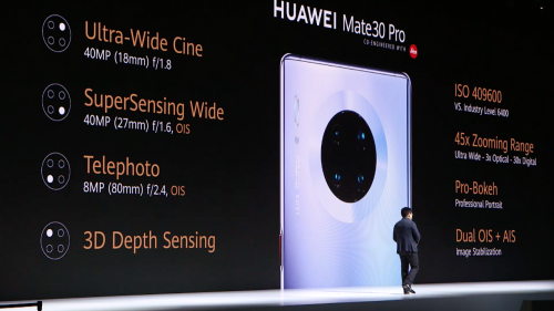 ส่วน Mate 30 PRO ประกอบด้วยเลนส์ 4 ตัว คือ Ultra-wide Cine 40 ล้านพิกเซลเทียบเท่าระยะ 18 มม. รูรับแสง f1.8 , เลนส์ SuperSensing Wide  40 ล้านพิกเซลเทียบเท่าระยะ 27 มม. รูรับแสง f1.6 พร้อม OIS, เลนส์เทเลความละเอียด 8 ล้านพร้อม OIS เทียบเท่าระยะ 80 มม. ส่วนตัวสุดท้ายจะเป็น 3D Depth Sensing สามารถดัน ISO ได้ถึง 409600 การซูมออฟติคอลอยู่ที่ 3x ซูมดิจิทัล 30x มาพร้อมโหมด Pro bokeh ถ่ายหน้าชัดหลังเบลอ ทำโบเก้ได้เหมือนกล้อง DSLR