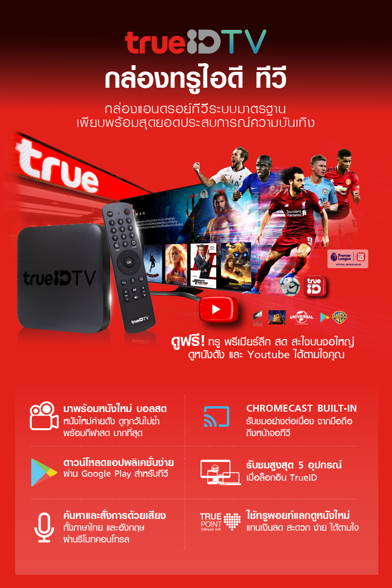 กล่อง True ID TV ตัวนี้เป็นกล่องแอนดรอยด์ ทีวีแท้ เจ้าแรกในไทยเวอร์ชั่นล่าสุด 8.0 การชมฟุตบอลจะไหลลื่น ภาพคมชัดจัดเต็ม มีฟีเจอร์การดูย้อนหลังได้ เวลาที่พลาดช็อตสำคัญ มีฟีเจอร์ระบบค้นหาด้วยเสียง ทั้งไทย และอังกฤษ ติดโครมแคสมาในกล่องสามารถสตรีมภาพจากอุปกรณ์ขึ้นจอทีวีได้ เปลี่ยนทีวีธรรมดาเป็นสมาร์ททีวีได้ ที่สำคัญยังใช้ได้กับเน็ตทุกเครือข่าย ทั้ง LAN หรือ WiFi ไม่ต้องเปลี่ยนกันให้วุ่น