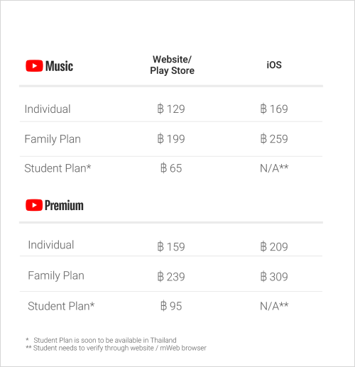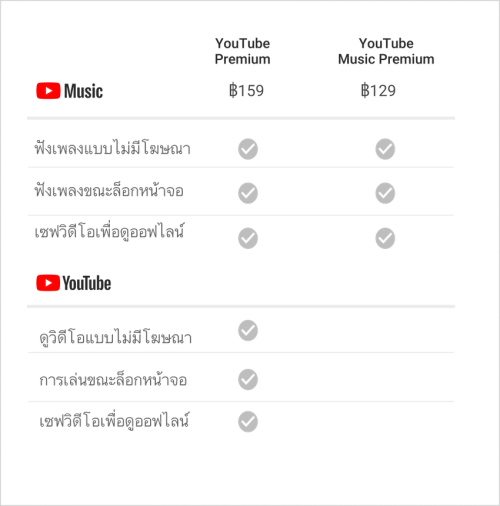 นอกจากนี้ YouTube ยังได้เปิดตัว YouTube Premium ในไทย โดยมีค่าบริการ 159 บาทต่อเดือน ซึ่งผู้ที่สมัครเป็นสมาชิก YouTube Premium จะได้รับสิทธิ์เป็นสมาชิก YouTube Music Premium โดยอัตโนมัติ และสามารถเพลิดเพลินไปกับการดูวิดีโอแบบไม่มีโฆษณา รวมถึงการเล่นวิดีโออยู่เบื้องหลังและการดาวน์โหลดวิดีโอเพื่อดูแบบออฟไลน์