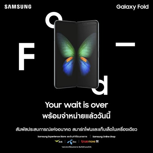 สิ้นสุดการรอคอยกับการวางจำหน่ายอย่างเป็นทางการของสมาร์ทโฟนหน้าจอพับได้สุดพรีเมี่ยม “ซัมซุง กาแลคซี่ โฟลด์” ความหรูหราที่แตกต่าง ซึ่งมาพร้อมกับประสบการณ์เหนือระดับแห่ง การบริการ ที่พร้อมให้คนไทยทั้งประเทศได้สัมผัสประสบการณ์ยอดเยี่ยมที่สุดในการใช้สมาร์ทโฟนอันล้ำยุคในทุกองค์ประกอบ ตั้งแต่วันที่ 20 พฤศจิกายน 2562 เป็นต้นไป ณ ซัมซุง เอ็กซ์พีเรียนซ์ สโตร์ และผู้ให้บริการเครือข่ายในสาขาที่กำหนด