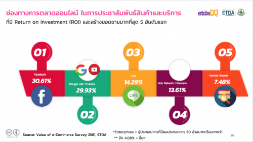สำหรับคนที่สนใจเรื่องสถิติของการซื้อขายของออนไลน์ ทาง EDTA เองก็ได้ทำรายงานที่น่าสนใจให้คนที่ค้าขายออนไลน์ได้ทราบถึงข้อมูลสำคัญๆเป็นประจำทุกปี ไม่ว่าจะเป็นรายงานตัวเลขผู้ใชิอินเทอร์เน็ตในประเทศไทย คนไทยใช้เวลาบนโลออกออนไลน์ไปกับอะไร แพลตฟอร์มไหนคนใช้งานเยอะ มีพฤติกรรมการใช้งานเป็นอย่างไร เราสามารถเอาข้อมูลเหล่านี้มาวิเคราะห์เพื่อใช้สื่อสารกับกลุ่มเป้าหมายได้อย่างมีประสิทธิภาพ