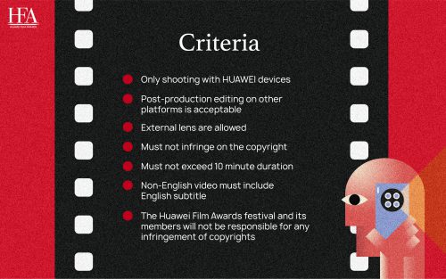 หนังสั้นที่ส่งเข้าประกวดนั้นจะต้องถ่ายทำด้วยสมาร์ทโฟนของ HUAWEI เท่านั้น ไม่สามารถถ่ายทำด้วยกล้อง DSLR หรือกล้อง Action Cam ได้ ใครมีเลนส์เสริมติดกับสมาร์ทโฟนอยู่แล้วอันนี้ใช้ได้ไม่ผิดกติการ