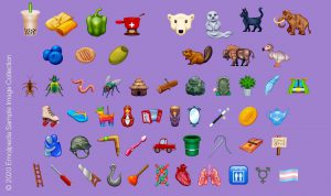 โดย 117 อิโมจินี้ก็จะมีทั้งคน สัตว์ กิจกรรมกีฬาต่างๆ ของกิน ของเล่น ของใช้ และอื่นๆ ในอิโมจิที่เป็นคนจะมีสกินโทนแยกย่อยออกมาทั้งผิวขาว ผิวเหลืองและผิวสี