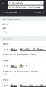 2. เมื่อกดค้นหาเส้นทาง แอปฯจะแสดงเส้นทางหลายแบบให้เราเลือกพร้อมคำนวณเวลาการเดินทางให้ ก็เลือกการเดินทางแบบที่เราสะดวกที่สุด ใครขยันรอ ขยันเปลี่ยนสายก็ไปรถเมล์ยาวเลยก็ได้ หรือจะไปรถเมล์แล้วต่อด้วยรถไฟฟ้าก็ตามใจเราเลยค่ะ