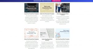 อีกหนึ่งเว็บไซต์ที่มีเทมเพลสสวยๆให้โหลดมากมาย แบ่งเป็นหมวดหมู่ให้เลือกค้นหาได้ มีตัวอย่างแต่ละหน้าสไลด์ให้ดูก่อนโหลด แต่ส่วนใหญ่โหลดมาจะไม่ใช่เวอร์ชันเต็ม เป็นเวอร์ชันฟรีที่จะมีประมาณ 15 หน้าสไลด์ ซึ่งถ้าอยากได้เวอร์ชันเต็มต้องเสียเงิน (ส่วนตัวคิดว่าแค่เวอร์ชันฟรีก็เพียงพอแล้วถ้าไม่ใช่งานแบบมืออาชีพขนาดนั้น) โหลดมาจะเป็นไฟล์ zip ต้องแตกไฟล์ก่อน และไม่ได้ฝังฟอนต์มาให้แต่มีลิงก์ให้ดาวน์โหลดฟอนต์และเวอร์ชันเต็มในสไลด์