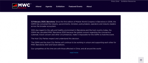 ก่อนหน้านี้ทางค่ายผู้ผลิตมือถือหลายรายก็ออกมาประกาศถอนตัวจากงาน MWC 2020 ไม่ว่าจะเป็น Sony, ZTE, LG , Amazon  เป็นต้น ด้วยการให้เหตุผลว่าเป็นห่วงเรื่องของไวรัสโคโรนา เมื่อแบรนด์ใหญ่ๆขอถอนตัวอย่างต่อเนื่อง นั่นถือเป็นสัญญาณบอกถึงความยากลำบากในการจัดงานในปีนี้