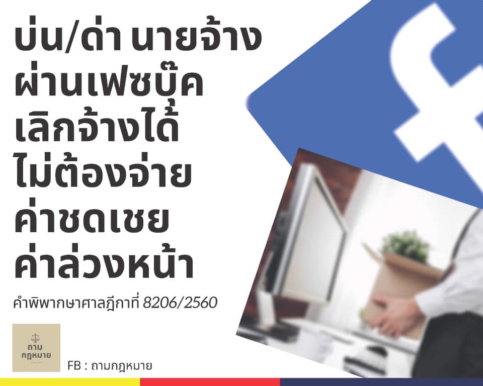 “การเขียนข้อความ บ่น/ตัดพ้อ นายจ้าง ย่อมมีผลกระทบต่อภาพลักษณ์ในการบริหารของนายจ้าง ซึ่งมีความสำคัญต่อการตัดสินใจเลือกใช้บริการของลูกค้า การกระทำของลูกจ้างที่โพสต์บ่น/ตัดพ้อนายจ้างจึงเป็นการจงใจทำให้นายจ้างได้รับความเสียหาย ตาม พ.ร.บ.คุ้มครองแรงงาน พ.ศ. 2541 มาตรา 119 (2) และเป็นการกระทำประการอื่นอันไม่สมแก่การปฏิบัติหน้าที่ของตนให้ลุล่วงไปโดยถูกต้อง และสุจริต ตาม ป.พ.พ. มาตรา 583 นายจ้างเลิกจ้างได้ ไม่ต้องจ่ายค่าชดเชย และสินจ้างแทนการบอกกล่าวล่วงหน้า”
