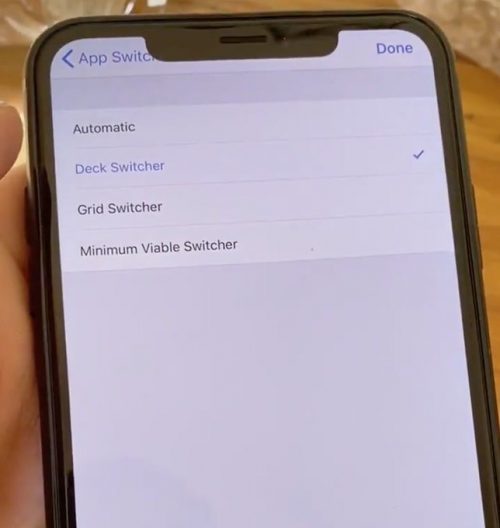 นอกจากนั้นเขายังทำการโพสต์รูป screenshot แสดงให้เห็นว่าเราสามารถเลือกรูปแบบการสลับแอปได้ระหว่าง Grid Switcher หรือ Deck Switcher แต่ทาง Geskin ไม่สามารถพิสูจน์ได้ว่า iPhones จะใช้งาน Split View ได้เหมือนกับ iPad รึเปล่า
