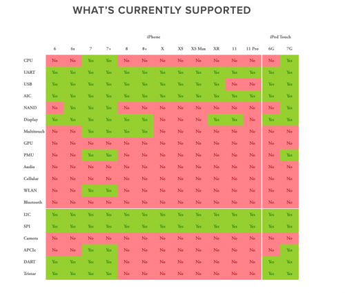 แน่นอนว่าตอนนี้มันยังเป็นแค่ช่วงเริ่มต้นเท่านั้น ยังมีอีกหลายเรื่องที่ต้องพัฒนาให้ดีขึ้น แม้จะลงระบบปฏิบัติการได้ แต่บางฟีเจอร์ก็ยังไม่สามารถทำงานได้กับไอโฟนบางรุ่น เช่น  GPU, เสียงยังไม่ออกลำโพง,  ไม่สามารถเชื่อมต่อเครือข่ายมือถือและ Bluetooth รวมถึงกล้องยังไม่สามารถใช้ได้