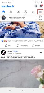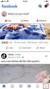 • แรกเลยเราก็เปิด Facebook ของเราขึ้นมา จากนั้นก็เลือก -ขีด 3 ขีด- บริเวณมุมขวาล่างของหน้าจอ