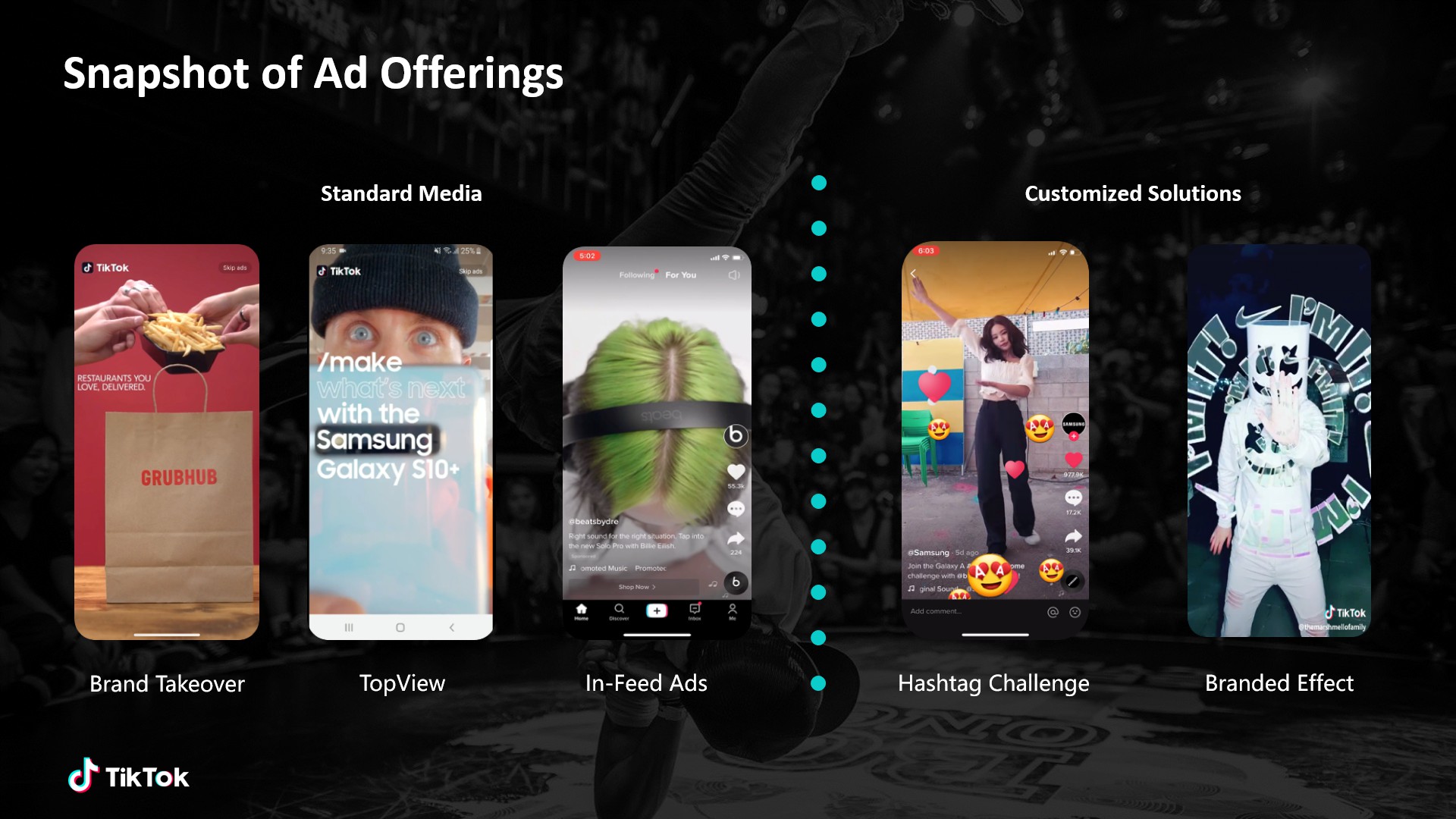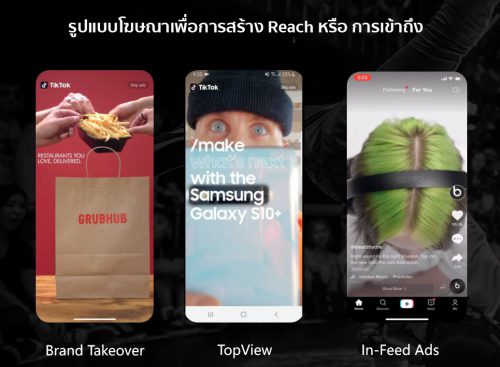 TikTok แพลตฟอร์มสร้างสรรค์วิดีโอสั้นที่กำลังในขณะนี้ ถือเป็นแพลตฟอร์มที่นำเทรนด์คอนเทนท์วิดีโอสั้นในรูปแบบเข้าใจง่าย กระชับ และสนุกสนาน ที่จะพลิกโฉมการทำ Digital Marketing ตอบโจทย์แบรนด์ที่ต้องการสร้างการรับรู้ (awareness) และการปฏิสัมพันธ์ (engagement) ระหว่างแบรนด์กับกลุ่มเป้าหมายคนรุ่นใหม่ได้จนเป็นกระแสไวรัลอย่างรวดเร็ว ผ่านคอนเทนท์วิดีโอสั้นสุดครีเอทบน Challenge Campaign ที่สร้างประวัติศาสตร์การทำไวรัลมาแล้วทั่วโลกในรูปแบบโฆษณามิติใหม่ที่ไม่เหมือนใคร โดยรูปแบบการโฆษณาของ TikTok ที่เกิดขึ้นมี 2 ประเภท คือ