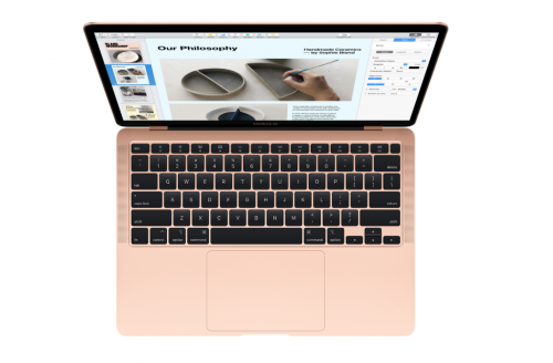 MacBook Air มาพร้อม Magic Keyboard ใหม่ แบบเดียวกับที่ใช้บน MacBook Pro ขนาด 16 นิ้ว ปุ่มกดกลไกแบบกรรไกร ระยะห่างระหว่างแป้นอยู่ที่ 1 มิลลิเมตร ช่วยให้พิมพ์สะดวกขึ้น ปุ่มลูกศรเรียงใหม่เป็นรูปตัว “T” กลับหัวก็จะช่วยให้ผู้ใช้หาปุ่มเจอได้ง่ายขึ้นโดยไม่ต้องก้มมอง