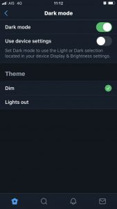 - จากนั้นก็เข้าไปเปิดใช้งาน Dark Mode ก่อนนะคะ.. จากนั้นก็จะเห็นว่าข้างล่างมีให้เลือก -Dim- และ -Lights out- หรือก็คือหรี่ไฟกับปิดไฟบนเวอร์ชันของ PC นั่นเอง จากนั้นก็เราเลือกเลยค่ะ.. ชอบอันไหนเลือกอันนั้น.. อ่อ..เวอร์ชันสมาร์ทโฟนเขาไม่มีสีไอคอนให้เลือกนะคะ..