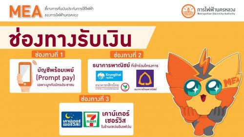 - ลงทะเบียนออนไลน์ผ่านแอป MEA Smart Life, เว็บ www.mea.or.th รวมถึงทางสื่อออนไลน์ Facebook, Twitter และ LINE ของการไฟฟ้านครหลวง