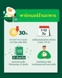 - ปรับลดเพดานค่าคอมมิชชันสำหรับพาร์ทเนอร์ร้านอาหาร (ไม่รวม GrabKitchen) สูงสุดจาก 35% เป็น 30% ครอบคลุมทั้งร้านค้าเดิมและร้านค้าใหม่ เพื่อช่วยลดภาระค่าใช้จ่ายให้กับผู้ประกอบการ โดยเริ่มต้นตั้งแต่วันที่ 1 เมษายนเป็นต้นไป