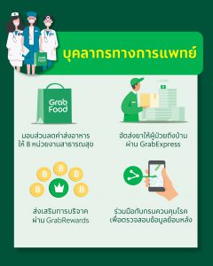- มอบส่วนลดค่าส่งเมื่อสั่งอาหารผ่านแกร็บฟู้ดให้กับข้าราชการและเจ้าหน้าที่ของกรมควบคุมโรค ตลอดจนบุคลากรทางการแพทย์ของโรงพยาบาลรัฐ 7 แห่ง อันได้แก่ สถาบันบำราศนราดูร สถาบันราชประชาสมาสัย โรงพยาบาลรามาธิบดี โรงพยาบาลจุฬาลงกรณ์ โรงพยาบาลราชวิถี โรงพยาบาลศิริราช และ โรงพยาบาลศิริราชปิยมหาราชการุณย์ ตั้งแต่วันที่ 26 มีนาคมจนถึง 30 มิถุนายน