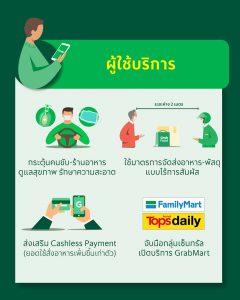- ส่งเสริมให้ผู้ใช้บริการชำระค่าบริการผ่านบัตรเครดิตหรือกระเป๋าเงินอิเล็กทรอนิกส์ (E-Wallet) แทนการใช้เงินสด เพื่อหลีกเลี่ยงการสัมผัสเงินสด นอกจากนี้ แกร็บยังได้ร่วมมือกับธนาคารต่าง ๆ ในการทำโปรโมชันเพื่อส่งเสริมให้ผู้ใช้บริการหันมาใช้ชำระเงินผ่านระบบดิจิทัลมากขึ้น โดยในช่วงที่ผ่านมาพบว่า ยอดสั่งอาหารผ่านแกร็บฟู้ดโดยไม่ใช้เงินสด (Cashless Payment) เพิ่มขึ้นกว่าเท่าตัว