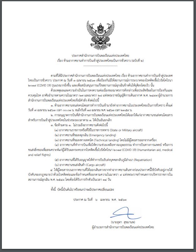 โดยนายจุฬา สุขมานพ ผู้อำนวยการสำนักงานการบินพลเรือนแห่งประเทศไทย (กพท.) ไดลงนามในประกาศเรื่องห้ามอากาศยานทำการบินเข้าสู่ประเทศไทยเป็นการชั่วคราว(ฉบับที่2) ดังต่อไปนี้