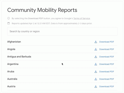 เพื่อช่วยสนับสนุนการทำงานของเจ้าหน้าที่สาธารณสุขในสถานการณ์ของการระบาดของ COVID-19 ทั่วโลกขณะนี้ ทาง Google ได้เผยแพร่รายงาน COVID-19 Community Mobility Reports เพื่อให้ข้อมูลเชิงลึกเกี่ยวกับการเปลี่ยนแปลงที่เกิดขึ้นจากการทำงานจากบ้าน การอยู่แต่ภายในที่พักอาศัย และนโยบายอื่น ๆ เพื่อไม่ให้ตัวเลขผู้ติดเชื้อเพิ่มสูงขึ้น โดยรายงานดังกล่าวได้รับการพัฒนาให้สามารถนำไปต่อยอดให้เกิดประโยชน์