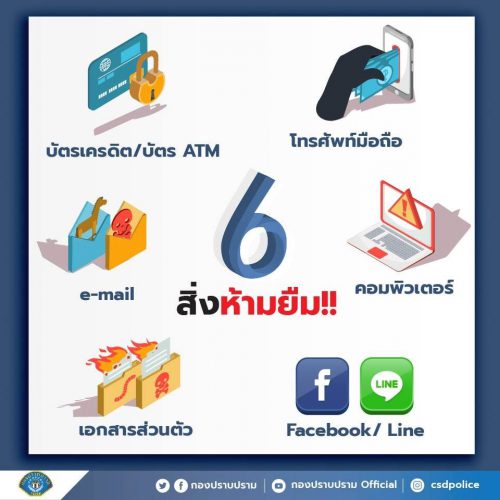 ปัจจุบันนี้เทคโนโลยีเป็นสิ่งที่ทำให้เราสามารถเชื่อมถึงกันง่ายขึ้น การเข้าถึงข้อมูลต่างๆ ก็ทำได้สะดวก เผลอๆ บางคนก็เลือกเก็บข้อมูลสำคัญๆ ของตนเองไว้บนโลกออนไลน์ที่คิดว่าจะปลอดภัย แต่จริงๆ แล้วอาจจะมีภัยแฝงอยู่หากเราไม่ระมัดระวังให้ดี ปัจจุบันสถิติการเกิดอาชญากรรมทางด้านเทคโนโลยีนั้นมีแนวโน้มมากขึ้น โดยอ้างอิงจาก Facebook ‘กองปราบปราม’ ได้รวบรวม 6 สิ่งที่ปัจจุบันไม่ควรให้ยืม เพื่อป้องกันการโจรกรรมข้อมูลส่วนบุคคล และถูกนำไปใช้ฉ้อโกงหรือก่ออาชญากรรมอื่นๆ ได้ ดังนี้