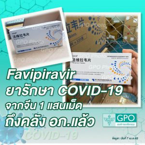 องค์การเภสัชกรรม (GPO) ได้ทำการนำเข้ายาฟาวิพิราเวียร์ (Favipiravir) จากประเทศจีนจำนวนทั้งสิ้น 100,000 เม็ด ซึ่งในขณะนี้ ยาทั้งหมดได้ถูกส่งมาถึงที่คลังยาขององค์การเภสัชกรรมเรียบร้อยแล้วเตรียมที่จะแจกจ่ายให้กับโรงพยาบาลต่างๆเพื่อใช้ในการรักษาผู้ป่วยจากเชื้อไวรัส Covid-19 ต่อไป