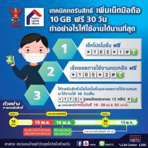 สำนักงาน กสทช. ขอย้ำว่าประชาชนไม่ต้องรีบกดรับสิทธิ์ มีเวลากดรับสิทธิ์ได้จนถึงวันที่ 30 เม.ย. 2563 เวลา 24.00 น. เพื่อให้ใช้งานเน็ต 10 GB นี้ให้ได้นาน 30 วันเต็ม ใครที่เพิ่งเติมเงินซื้อแพ็คเกจไป แล้วระยะเวลาการใช้งาน สิ้นสุดในช่วงเวลาการกดรับสิทธิ์ แนะนำให้ใช้เน็ตของตัวเองให้หมดก่อนแล้วจึงค่อยกด *170*ตามด้วยหมายเลขบัตรประชาชน 13 หลัก# แล้วกดโทรออกเพื่อรับสิทธิ์ หลังจากได้รับ sms ยืนยัน สามารถใช้งาน ได้ 30 วันเต็ม