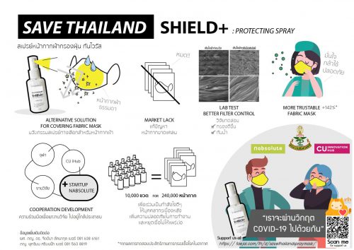 ทางทีมวิจัย ผศ. ดร. ภญ. จิตติมา ลัคนากุล คณะเภสัชศาสตร์ จุฬาลงกรณ์มหาวิทยาลัยจึงได้พัฒนาสเปรย์มีชื่อว่า ชีลด์พลัส โพรเทคติ้ง สเปรย์ (Shield+ Protecting Spray) เพื่อใช้ฉีดพ่นหน้ากากผ้าให้ช่วยปกป้องเราได้มากขึ้น ทั้งการป้องกันไวรัส กันละอองคัดหลั่งและกันน้ำโดยผลิตมาจากสารที่ไม่เป็นอันตรายต่อระบบหายใจของเรา
