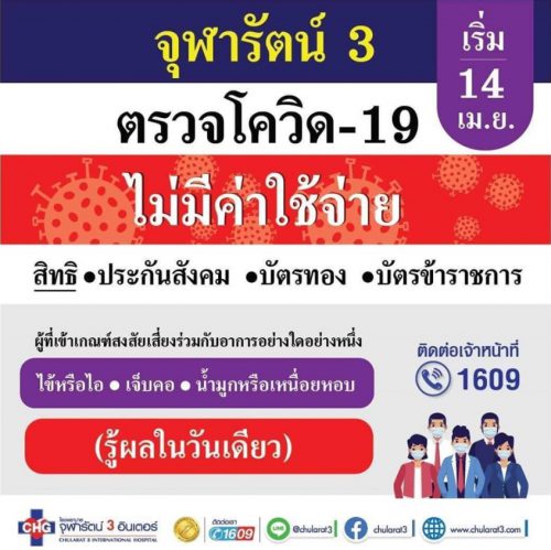 ใครที่ถือสิทธิ์บัตรประกันสังคม บัตรข้าราชการและบัตรทอง 30 บาท แล้วเข้าข่ายว่าตัวเองจะติดเชื้อ COVID-19 ตอนนี้ทางรพ.จุฬารัตน์ 3 อินเตอร์ เปิดให้คนสามกลุ่มนี้สามารถตรวจ COVID-19 ได้ฟรี ไม่มีค่าใช้จ่าย แถมรู้ผลใน 1 วัน โดยเปิดบริการไปแล้วตั้งแต่วันที่ 14 เมษายนที่ผ่านมา