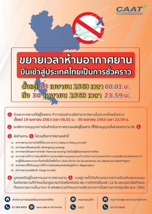 1.ห้ามอากาศยานขนส่งคนโดยสารทำการบินเข้ามายังท่าอากาศยานในประเทศไทยเป็นการชั่วคราว ตั้งแต่ วันทื่ 19 เมษายน 2563 เวลา 00.01 น. จนถึงวันที่ 30 เมษายน พ.ศ. 2563 เวลา 23.59 น.