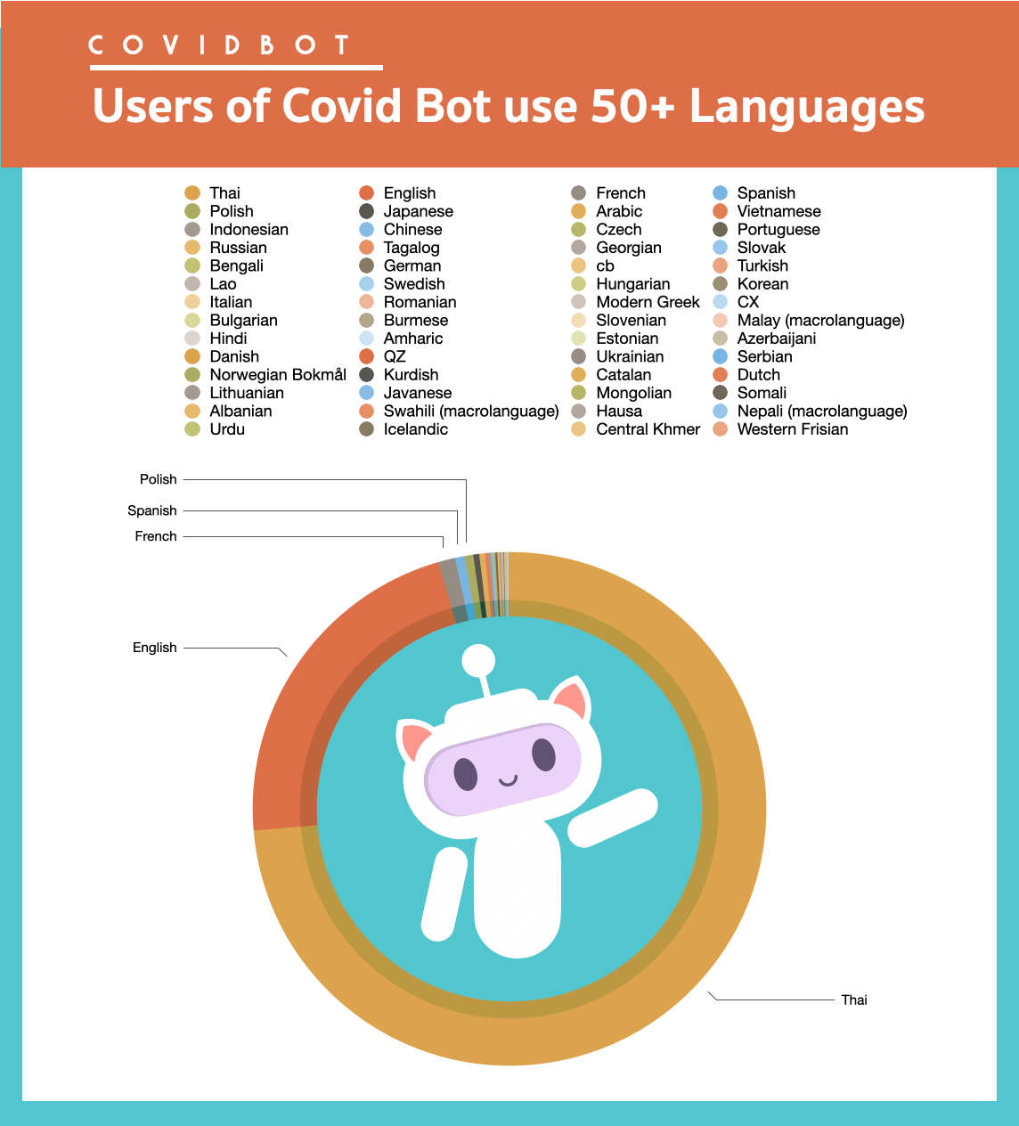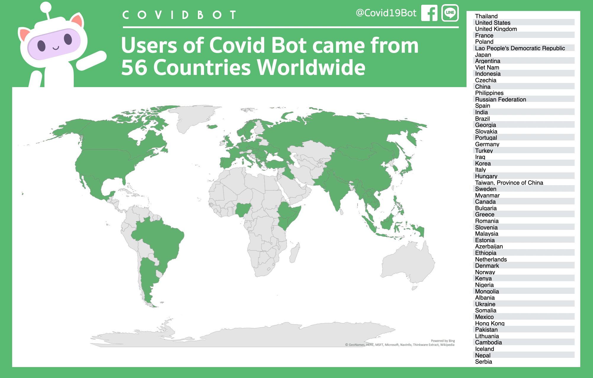 นอกจากจะช่วยประเทศไทยแล้ว ทืม Covid Bot ยังมีการแชร์ความรู้ และ know-how ด้าน chatbot ให้กับต่างประเทศ อย่าง slovenia พม่า แล้วก็ ลาว อีกด้วย ทางทีม Covid Bot ยังฝากขอบคุณทุกภาคส่วนผ่านช่องทาง Dailygizmo.tv อีกด้วยว่า ทั้งภาครัฐบาล influencers มีส่วนช่วยให้ น้องหน้ากาก ของ covidbot เป็นที่รู้จัก และได้รับความรักจากผู้ใช้ทั้งในประเทศไทยและอีกหลายและเทศทั่วโลก ถึง 30,000 คน!
