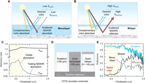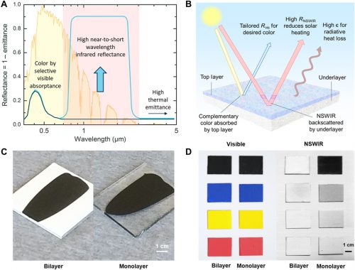 ก่อนหน้านี้ทางนักวิจัยได้พัฒนาพื้นผิวที่สามารถสะท้อนแสงอาทิตย์กลับไปเพื่อให้อาคารมีความเย็น แต่ส่วนใหญ่นั้นจะเป็นสีขาวทำให้เกิดแสง glare เมื่อสะท้อนเข้าดวงตาคนอาจจะก่อให้เกิดอันตรายได้ เพื่อแก้ปัญหานี้เขาก็เลยสร้างสีขึ้นมาอีกชั้นนึงโดยมีความหนาแค่ครึ่งมิลลิเมตรเท่านั้น ซึ่งสีชั้นนี้จะมีความบาง ประกอบด้วยรูเล็กๆเป็นจำนวนมากเพื่อสะท้อนแสงอินฟราเรดที่ทำให้เกิดความร้อนกลับไป ส่วนสีชั้นนอกจะประกอบด้วย เม็ดสีและไทเทเนียมไดออกไซด์ที่ทำหน้าที่ดูซับแสง ผลที่ได้คือสีสองชั้นนี้สามารถลดความร้อนได้ถึง 15.6 เซลเซียสเลยทีเดียว