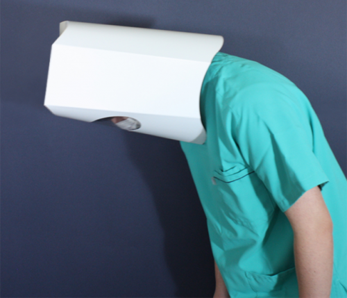 หมวกนี้ทำมาจากกระดาษเพียงชิ้นเดียว พับมาเป็นแผ่นแบน เพียงแค่กางออกมาก็สามารถใช้งานได้ทันที ไม่ต้องใส่สายรัด ไม่ต้องใช้ลวดเย็บกระดาษ ด้านหน้ามีการเจาะช่องติดฟิล์มใสเข้าไปเพื่อช่วยให้มองเห็นสิ่งต่างๆได้ นอกจากนั้นตัวหมวกจะล็อกเข้ากับศีรษะเรา แม้จะก้มหน้าก็ไม่หลุดง่ายๆ
