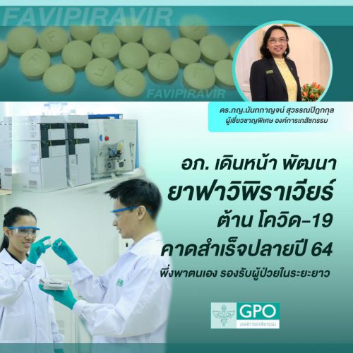 ทางองค์การเภสัชกรรม (อภ.) ประกาศความสำเร็จในการพัฒนายาฟาวิพิราเวียร์ เพื่อใช้รักษาโรคติดเชื้อไวรัสโคโรนา 2019 ในระดับห้องปฏิบัติการ พร้อมก้าวสู่กระบวนการผลิต ตั้งแต่วัตถุดิบจนเป็นเม็ดยาสำเร็จรูป คาดสำเร็จปลายปี 64 พึ่งพาตนเองรองรับผู้ป่วยระยะยาว