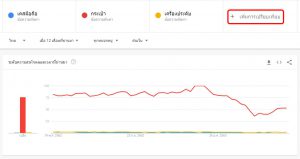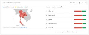 - และเมื่อเลื่อนลงมาด้านล่างก็จะเห็นได้ว่านอกจากจะแสดงกราฟการค้นหาของผู้ใช้งานแล้ว ยังแสดงให้เราเห็นอีกด้วยว่าพื้นที่ไหนในประเทศไทยที่มีการค้นหาคีย์เวิร์ดเหล่านั้นมากที่สุดอีกด้วย