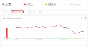 - หลังจากเรากดเสิร์ชแล้ว.. ระบบจะพาเรามาที่หน้าที่มีลักษณะเหมือนกราฟ ที่จะแสดงให้เห็นถึงการค้นหาในอินเตอร์เน็ตของคนในประเทศ โดยแสดงให้เห็นในสีที่แตกต่างกันเราจะได้เห็นกราฟชัดๆ.. ซึ่งครั้งแรกที่โชว์จะเป็นการค้นหาในรอบ 12 เดือน ซึ่งให้เราจิ้มที่บริเวณกรอบสีแดงนั่นเลยค่ะ เขาจะมีให้เราเลือกช่วงเวลาของการค้นหาค่ะ