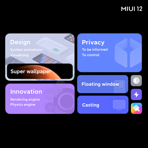 พร้อมกันนี้ยังได้เปิดตัว “Super Wallpaper” ด้วยธีมวอลเปเปอร์เป็นฉากรูปจักรวาลที่สวยงามน่าทึ่งของโครงสร้างดาวเคราะห์ จากภาพถ่ายอย่างเป็นทางการของนาซ่า ซึ่ง Super Wallpapers นี้สามารถนำมาแสดงบนหน้าจอหลัก Always-on display, Home screen และ Lock screen ได้ในรูปแบบที่เป็นภารกิจการท่องอวกาศที่น่าตื่นเต้น ซึ่งเผยให้เห็นภาพบางส่วนของดวงเคราะห์ที่ไกลออกไปในระหว่างที่มีการใช้งาน ด้วย Super Wallpapers ทำให้ MIUI 12 กลายเป็นหน้าจอที่แสดงให้เห็นถึงเส้นทางความงดงามของจักรวาล