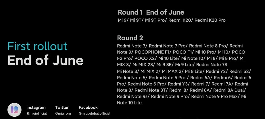 สำหรับการเปิดตัวครั้งแรกของ MIUI 12 จะเกิดขึ้นภายในเดือนมิถุนายน 2563 ในบางรุ่นก่อนที่จะทยอยเปิดแต่ละรุ่นเพิ่มเติม