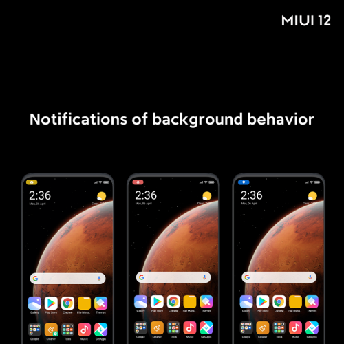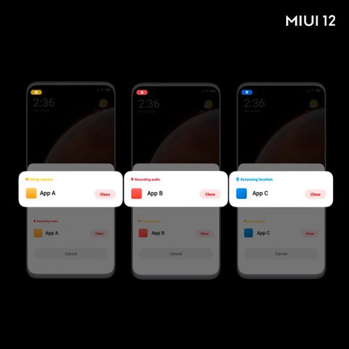 MIUI 12 เพิ่มความสามารถในการรักษาความปลอดภัย โดยจะมีการแจ้งเตือนผู้ใช้งานเกี่ยวกับการทำงานของแอปต่างๆ และผู้ใช้งานสามารถควบคุมแอปในการขอเข้าถึงการใช้งานได้มากขึ้น เพื่อให้ผู้ใช้งานทราบอยู่ตลอดเวลา MIUI 12 จึงเพิ่มฟีเจอร์การเเจ้งเตือนการขออนุญาตการเข้าถึง โดยที่ระบบจะมีการแจ้งเตือนแสดงขึ้นบนแถบสถานะเมื่อพบแอปที่เข้าถึงกล้อง, ที่อยู่ และไมโครโฟน ที่ทำงานเบื้องหลัง ระบบจะมีปุ่มกดให้กดตัวแจ้งเตือน เพื่อทำให้ผู้ใช้สามารถเปลี่ยนการตั้งค่าการขออนุญาตการเข้าถึง และหยุดการทำงานของแอปที่น่าสงสัยที่ทำงานเบื้องหลังได้ทุกเวลา