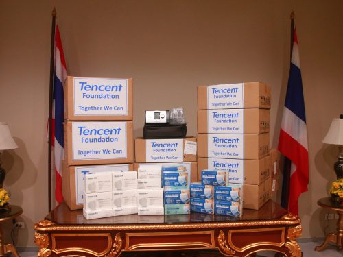 นายสุชาติ ตันเจริญ (ที่ 4 จากขวา) รองประธานสภาผู้แทนราษฎรไทย คนที่หนึ่ง รับมอบเครื่องช่วยหายใจจำนวน 10 เครื่อง และอุปกรณ์ทางการแพทย์ จำนวนกว่า 235,000 ชิ้น ที่ประกอบไปด้วย หน้ากากอนามัยชนิด KN95 จำนวน 30,000 ชิ้น หน้ากากอนามัย จำนวน 200,000 ชิ้น และอุปกรณ์ป้องกันภัยส่วนบุคคล หรือชุด PPE จำนวน 5,000 ชุด จากเทนเซ็นต์ (Tencent) บริษัทยักษ์ใหญ่ระดับโลก ที่ให้บริการด้านเทคโนโลยีบนอินเทอร์เน็ตและโซลูชันชั้นนำ โดยมีนายกฤตธี มโนลีหกุล (ที่ 4 จากซ้าย) กรรมการผู้จัดการ พร้อมด้วยนางสาววารีรัตน์ กิจชัยชาญกุล (ที่ 3 จากซ้าย) หัวหน้าฝ่ายบริหารงานทรัพยากรบุคคล และนางสาวชไมพร บุญต่อ (ที่ 2 จากซ้าย) หัวหน้าฝ่ายบริหารจัดการองค์กร บริษัท เทนเซ็นต์ (ประเทศไทย) จำกัด เป็นผู้แทนในการส่งมอบ