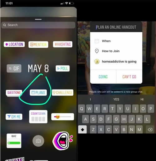 เมื่อเราใช้สติกเกอร์ Plan ลงใน Stories เราจะสามารถใส่วันที่ รวมถึงรายละเอียดที่ผู้ติดตามเราจะสามารถเข้าร่วมประชุมได้ นอกจากนั้นคนตั้งการประชุมยังสามารถรู้ได้ว่าใครที่เห็นแล้ว ใครที่ลงทะเบียนเข้าร่วมประชุมบ้าง ฟีเจอร์นี้ยังสามารถประยุกต์ใช้สำหรับงานสัมมนาออนไลน์, การเปิดตัวผลิตภัณฑ์ใหม่ๆ เป็นต้น