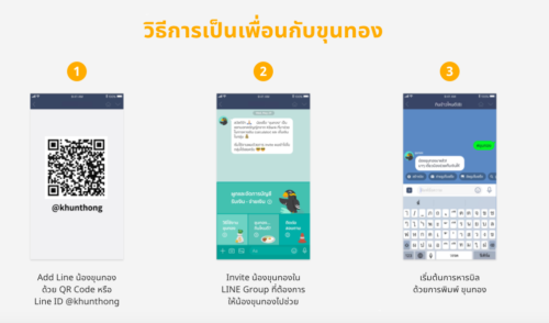 ใครที่มีกลุ่มเพื่อนอยู่แล้ว ให้เราเพิ่ม @KhunThong ก่อน จากนั้นค่อยชิญขุนทองเข้ามาอยู่ในกลุ่ม เมื่อต้องการใช้งานก็แค่พิมพ์คำว่า “ขุนทอง” ขุนทองก็จะพร้อมทำงานทันที ซึ่งมันจะทำงานเฉพาะเมื่อเรามีการพิมพ์ข้อความว่า “ขุนทอง” หรือ “เก็บเงิน” เท่านั้น ไม่ต้องห่วงว่าเวลาเราแชทคุยกับเพื่อนแล้วจะโผล่ขึ้นมากวนใจ