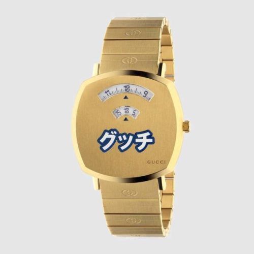 โดยรุ่นล่าสุดที่วางขายเฉพาะในญี่ปุ่นเรียกว่ามาในดีไซน์ที่ค่อนข้างแหวกแนว บนหน้าปัดด้านบนมีจอในสไตล์เรือนไมล์บอกเวลาและวันที่เท่านั้น ส่วนตรงกลางจะมีตัวอักษรภาษาญี่ปุ่นอย่างเด่ดชัด ซึ่งก็คือชื่อแบรนด์ Gucci ที่เขียนด้วยตัวอักษรคาตะคานะนั่นเอง (ส่วนชื่อแบรนด์ภาษาอังกฤษนั้นจะสลักเป็นตัวเล็กอยู่