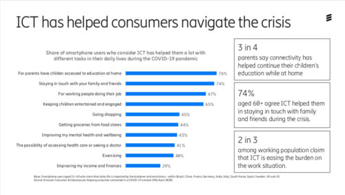 ผลวิจัยล่าสุดโดย Ericsson Consumer Lab ระบุ 83% ของผู้ตอบแบบสำรวจจาก 11 ประเทศ ที่ใช้งานเทคโนโลยี ICT อย่างมีนัยสำคัญช่วงล็อคดาวน์ เผยว่าในช่วงล็อคดาวน์ คนเหล่านั้นเปิดใช้บริการเทคโนโลยี ICT ต่าง ๆ มากขึ้น อาทิ แอปฯ เรียนออนไลน์และ แอปฯ ดูแลสุขภาพ ที่ช่วยให้พวกเขาปรับตัวเข้ากับการใช้ชีวิตวิถีใหม่ผ่านการเชื่อมต่อเครือข่าย