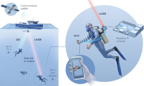 ก่อนอื่นเราต้องมีอุปกรณ์ที่ใช้ใต้น้ำได้ อย่างเช่น สมาร์ตโฟนกันน้ำในการรับส่งข้อมูล จากนั้นเราใช้การรับส่งสัญญาณไวไฟแบบเดิมในการเชื่อมต่อมือถือกับโมเด็มใต้น้ำที่พัฒนามาจาก Raspberry Pi ซึ่งติดอยู่ที่หลังของนักดำน้ำ จากนั้นโมเด็มจะเปลี่ยนสัญญาณไร้สายให้เป็นแสงเลเซอร์ ยิงกลับไปยังทุ่นที่ลอยอยู่เหนือผิวน้ำ จากนั้นทุ่นจะส่งสัญญาณต่อไปยังดาวเทียมเพื่อเชื่อมต่ออินเทอร์เน็ต